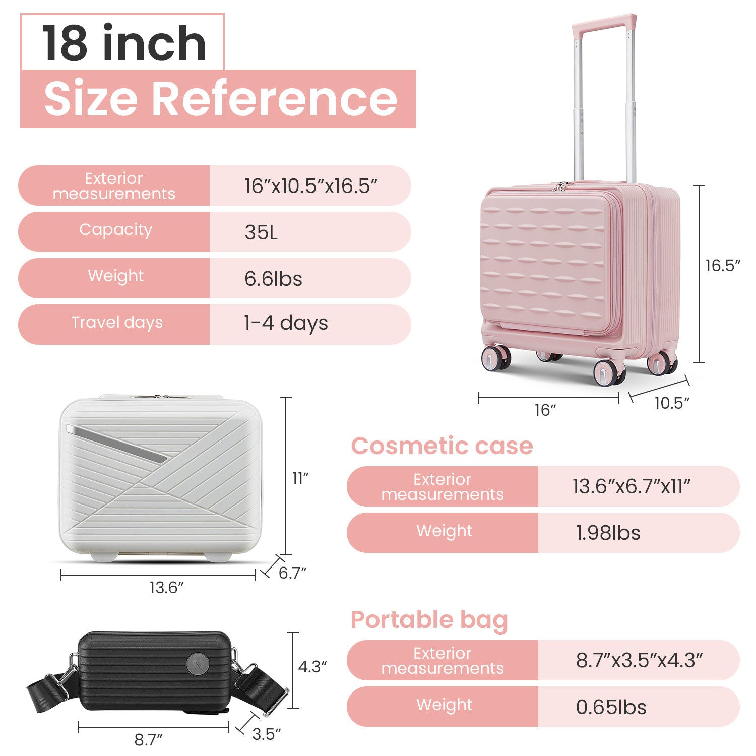 - 【Packaging】】Carry on Luggage Set include: 1*Crossbody Bag (Black), 1*Cosmetic Bag(White), 1*Carry-on Luggage (18 inch )